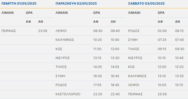 ฮคฮฟ ฯฮปฮฟฮฏฮฟ ฮธฮฑ ฮฑฮฝฮฑฯฯฯฮฎฯฮตฮน ฮฑฯฯ ฮ ฮตฮนฯฮฑฮนฮฌ ฯฮทฮฝ ฮ ฮญฮผฯฯฮท 1/5/2025 ฮบฮฑฮน ฯฯฮฑ 23:59, ฮณฮนฮฑ ฮฃฯฯฮฟ 03:55-04:25, ฮ ฮฌฯฮฟ 05:35-06:05, ฮฮฌฮพฮฟ 07:00-07:30, ฮฮฟฮฝฮฟฯฯฮฑ 08:40-09:00, ฮฮฌฮพฮฟ 10:15 ฮบฮฑฮน ฮตฮฝ ฯฯ