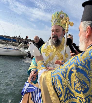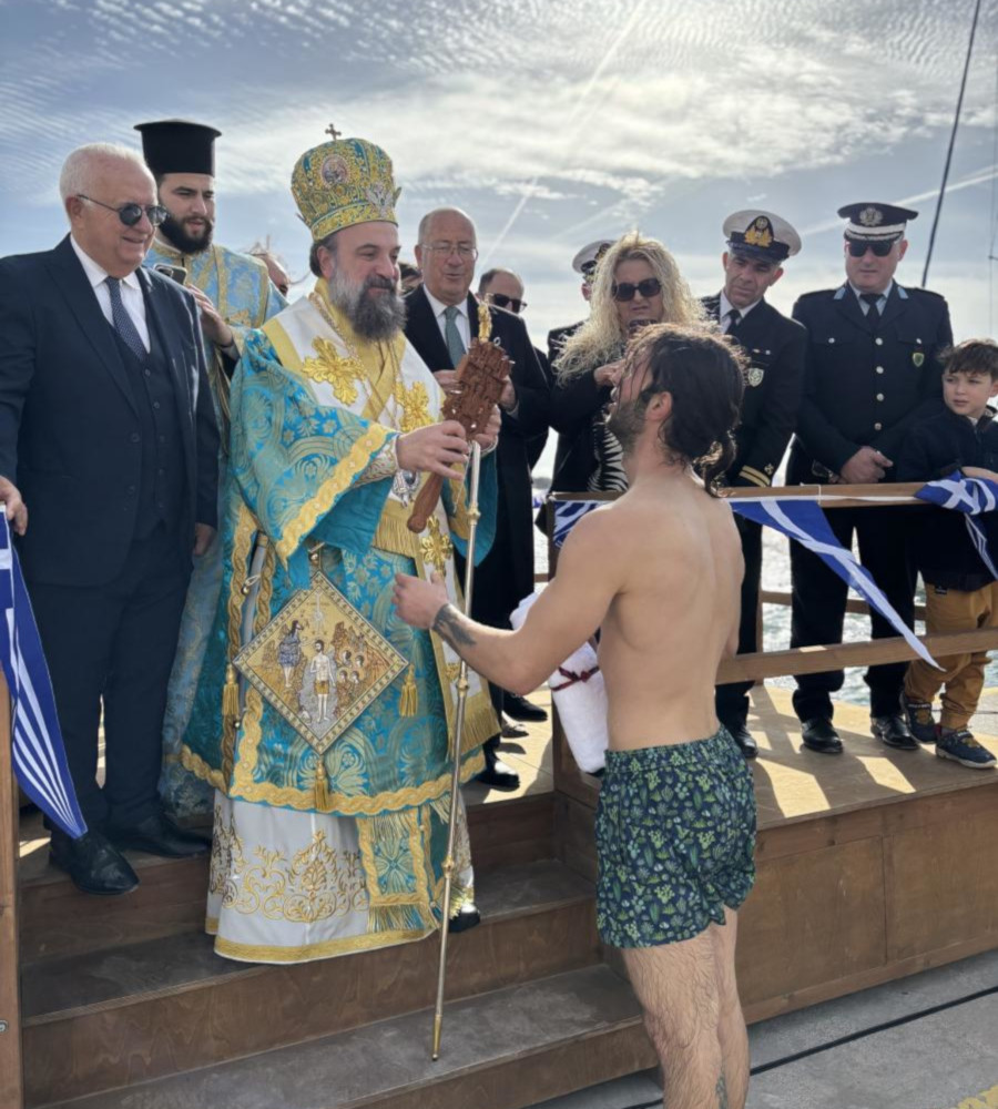 Στην συνέχεια μετέβη, μετά του ιερού Κλήρου και των εκπροσώπων των Αρχών, στο Αλιευτικό Καταφύγιο της Βλυχάδας όπου έλαβε χώρα η τελετή της καταδύσεως του Τιμίου Σταυρού και του Αγιασμού των υδάτων. Τον Σταυρό ανέσυρε από την θάλασσα o Αναστάσιος Γκιαούρης, στον οποίο ο Σεβασμιώτατος επέδωσε Σταυρό ως ευλογία, όπως συνηθίζεται.