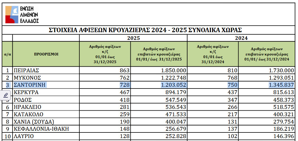 ฮฃฯ„ฮทย ฮฃฮฑฮฝฯ„ฮฟฯฮฏฮฝฮท, ฮท ฯƒฮตฮถฯŒฮฝ ฯ„ฮฟฯ… 2025 ฮณฮนฮฑ ฯ„ฮทฮฝ ฮบฯฮฟฯ…ฮฑฮถฮนฮญฯฮฑ ฮตฮฏฯ‡ฮต ฮพฮตฮบฮนฮฝฮฎฯƒฮตฮน ฮดฮนฯƒฯ„ฮฑฮบฯ„ฮนฮบฮฌ ฮบฮฑฮน ฮผฮต ฮฑฮบฯ…ฯฯŽฯƒฮตฮนฯ‚ ฯ€ฯฮฟฯƒฮตฮณฮณฮฏฯƒฮตฯ‰ฮฝ ฮปฯŒฮณฯ‰ ฯ„ฮทฯ‚ ฯ€ฯฯŒฯƒฯ†ฮฑฯ„ฮทฯ‚ ฯ„ฯŒฯ„ฮต ฯƒฮตฮนฯƒฮผฮนฮบฮฎฯ‚ ฮดฯฮฑฯƒฯ„ฮทฯฮนฯŒฯ„ฮทฯ„ฮฑฯ‚. ฮ‰ฯ„ฮฑฮฝ ฮตฯ€ฮฏฯƒฮทฯ‚ ฮท ฯ€ฯฯŽฯ„ฮท ฯ‡ฯฮฟฮฝฮนฮฌ ฯ€ฮฟฯ… ฮตฯ†ฮฑฯฮผฯŒฯƒฯ„ฮทฮบฮต ฮฑฯ…ฯƒฯ„ฮทฯฮฌ ฯ„ฮฟ berth allocation system ฮบฮฑฮน ฮฟ ฯ€ฯฮฟฮณฯฮฑฮผฮผฮฑฯ„ฮนฯƒฮผฯŒฯ‚ ฯ„ฯ‰ฮฝ ฮฑฯ†ฮฏฮพฮตฯ‰ฮฝ ฮณฮนฮฝฯŒฯ„ฮฑฮฝ ฮฑฯ€ฯŒ ฮฝฯ‰ฯฮฏฯ‚ ฮบฮฑฮน ฯ‡ฯ‰ฯฮฏฯ‚ ฮฝฮฑ ฮพฮตฯ€ฮตฯฮฝฮนฮญฯ„ฮฑฮน ฯ„ฮฟ ฮทฮผฮตฯฮฎฯƒฮนฮฟ ฯŒฯฮนฮฟ ฯ„ฯ‰ฮฝ 8.000 ฮตฯ€ฮนฯƒฮบฮตฯ€ฯ„ฯŽฮฝ. ฮœฮต ฮฑฯ…ฯ„ฮฌ ฯ„ฮฑ ฮดฮตฮดฮฟฮผฮญฮฝฮฑ, ฯ„ฯŒฯƒฮฟ ฮฟฮน ฮฑฯ†ฮฏฮพฮตฮนฯ‚ ฮบฯฮฟฯ…ฮฑฮถฮนฮตฯฯŒฯ€ฮปฮฟฮนฯ‰ฮฝ ฯŒฯƒฮฟ ฮบฮฑฮน ฮฟ ฮฑฯฮนฮธฮผฯŒฯ‚ ฮตฯ€ฮนฮฒฮฑฯ„ฯŽฮฝ ฮบฮนฮฝฮฎฮธฮทฮบฮฑฮฝ ฮตฮปฮฑฯ†ฯฮฌ ฯ€ฯ„ฯ‰ฯ„ฮนฮบฮฌ. ฮฃฯ…ฮณฮบฮตฮบฯฮนฮผฮญฮฝฮฑ, ฮฟฮน ฮฑฯ†ฮฏฮพฮตฮนฯ‚ ฮบฯฮฟฯ…ฮฑฮถฮนฮตฯฮฟฯ€ฮปฮฟฮฏฯ‰ฮฝ ฯ„ฮฟ 2025 ฮญฯ†ฯ„ฮฑฯƒฮฑฮฝ ฯ„ฮนฯ‚ 728 (-2,93%), ฮญฮฝฮฑฮฝฯ„ฮน 750 ฯ„ฮฟ 2024, 800 ฯ„ฮฟ 2023, 686 ฯ„ฮฟ 2022, 191 ฯ„ฮฟ 2021, 3 ฯ„ฮฟ 2020 ฮบฮฑฮน 592 ฯ„ฮฟ 2019, ฮตฮฝฯŽ ฮฟ ฮฑฯฮนฮธฮผฯŒฯ‚ ฮตฯ€ฮนฮฒฮฑฯ„ฯŽฮฝ ฮญฯ†ฯ„ฮฑฯƒฮต ฯ„ฮฟฯ…ฯ‚ 1.203.052 (-10,6%) ฮญฮฝฮฑฮฝฯ„ฮน 1.345.837 ฯ„ฮฟ 2024, 1.298.968 ฯ„ฮฟ 2023, 826.602 ฯ„ฮฟ 2022, 104.074 ฯ„ฮฟ 2021, ฮผฯŒฮปฮนฯ‚ 131 ฯ„ฮฟ 2020 ฮบฮฑฮน 980.771 ฯ„ฮฟ 2019.