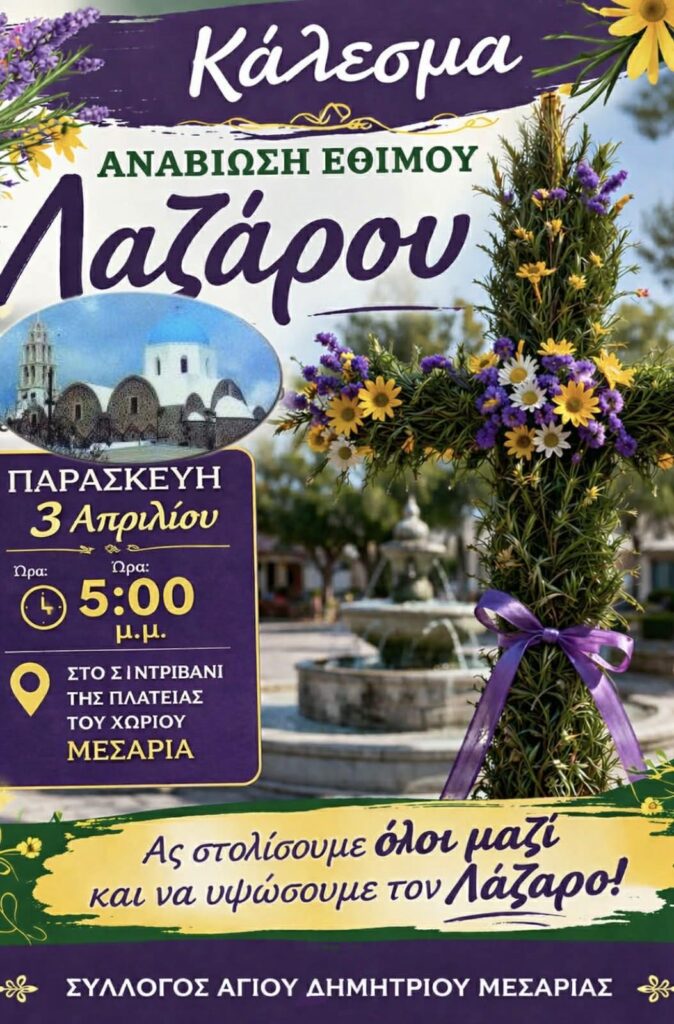 ฮฃฯ„ฮฟย ฮœฮตฮณฮฑฮปฮฟฯ‡ฯŽฯฮน, ฮผฮต ฯ„ฮทฮฝ ฮตฯ€ฮนฮผฮญฮปฮตฮนฮฑ ฯ„ฮฟฯ… ฮ ฮฟฮปฮนฯ„ฮนฯƒฯ„ฮนฮบฮฟฯ ฮฃฯ…ฮปฮปฯŒฮณฮฟฯ… “ฮคฮฟ ฮœฮตฯ„ฯŒฯ‡ฮน”, ฯƒฯ„ฮนฯ‚ 09:00 ฯ„ฮฟ ฯ€ฯฯ‰ฮฏ ฯ„ฮฟฯ… ฮฃฮฑฮฒฮฒฮฌฯ„ฮฟฯ… 4/4 ฮธฮฑ ฮฑฯฯ‡ฮฏฯƒฮตฮน ฯ„ฮฟ ฯƒฯ„ฯŒฮปฮนฯƒฮผฮฑ ฯ„ฮฟฯ… ฮ›ฮฑฮถฮฌฯฮฟฯ…, ฯƒฯ„ฮทฮฝ ฮบฮตฮฝฯ„ฯฮนฮบฮฎ ฯ€ฮปฮฑฯ„ฮตฮฏฮฑ ฯ„ฮฟฯ… ฯ‡ฯ‰ฯฮนฮฟฯ (ฮ ฮฟฯ„ฮฑฮผฯŒฯ‚), ฮบฮฑฮน ฯ„ฮฟ ฮฑฯ€ฯŒฮณฮตฯ…ฮผฮฑ ฮผฮตฯ„ฮฌ ฯ„ฮฟฮฝ ฮ•ฯƒฯ€ฮตฯฮนฮฝฯŒ, ฯ€ฮตฯฮฏฯ€ฮฟฯ… ฯƒฯ„ฮนฯ‚ 18:00, ฮธฮฑ ฯƒฮทฮบฯ‰ฮธฮตฮฏ ฮฟ ฮ›ฮฌฮถฮฑฯฮฟฯ‚ ฯƒฯ„ฮฟ ฮฏฮดฮนฮฟ ฯƒฮทฮผฮตฮฏฮฟ, ฮผฮต ฯ„ฮฟฮฝ ฯ€ฮฑฯฮฑฮดฮฟฯƒฮนฮฑฮบฯŒ ฯ„ฯฯŒฯ€ฮฟ.