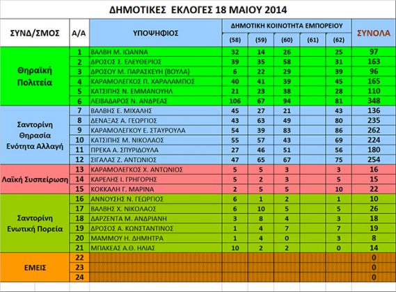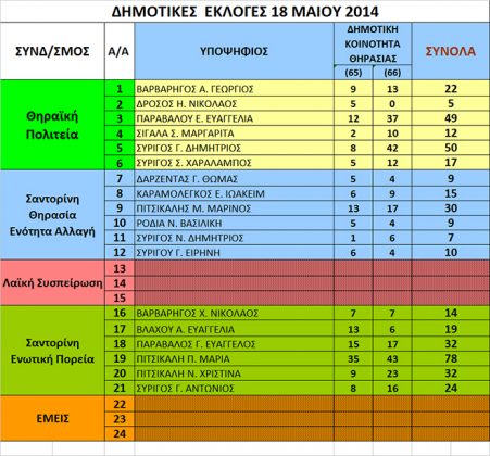 Τα αποτελέσματα της ψηφοφορίας για την εκλογή τοπικών συμβούλων στις Δημοτικές και Τοπικές Κοινότητες του Δήμου Θήρας έχουν ως εξής: