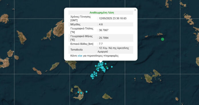 ฮฃฮตฮนฯฮผฮนฮบฮฎ ฮดฯฮฝฮทฯฮท ฮผฮตฮณฮญฮธฮฟฯ ฯ 4,6 ฮฒฮฑฮธฮผฯฮฝ ฯฮทฯ ฮบฮปฮฏฮผฮฑฮบฮฑฯ ฮกฮฏฯฯฮตฯ ฮบฮฑฯฮฑฮณฯฮฌฯฮทฮบฮต ฯฯฮนฯ 02:30 ฯฮทฯ ฮคฯฮฏฯฮทฯ 13 ฮฮฑฮฮฟฯ ฯฯฮฟฮฝ ฮธฮฑฮปฮฌฯฯฮนฮฟ ฯฯฯฮฟ ฮผฮตฯฮฑฮพฯ ฮฮผฮฟฯฮณฮฟฯ ฮบฮฑฮน ฮฃฮฑฮฝฯฮฟฯฮฏฮฝฮทฯ, ฯฯ ฮณฮบฮตฮบฯฮนฮผฮญฮฝฮฑ 12 ฯฮปฮผ. ฮฝฮฟฯฮนฮฟฮดฯ ฯฮนฮบฮฌ ฯฮทฯ ฮฯฮบฮตฯฮฏฮฝฮทฯ ฮฮผฮฟฯฮณฮฟฯ ฮบฮฑฮน ฯฮต ฮตฯฯฮนฮฑฮบฯ ฮฒฮฌฮธฮฟฯ 7,7 ฯฮปฮผ.
