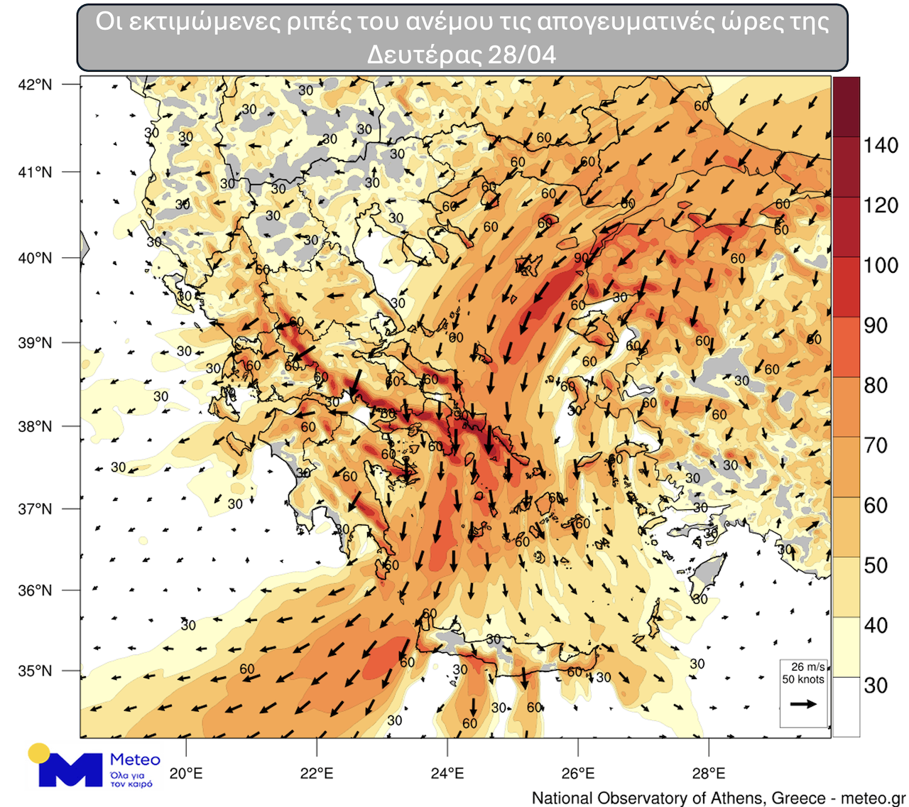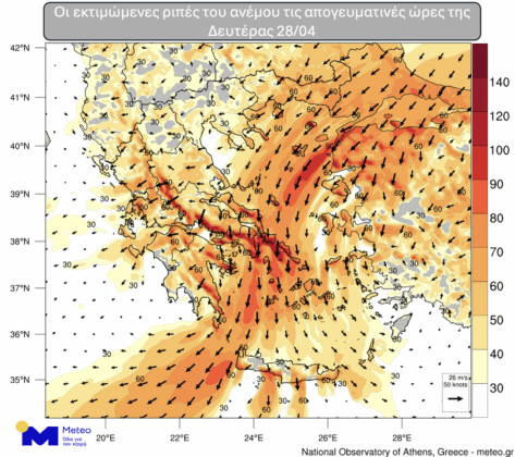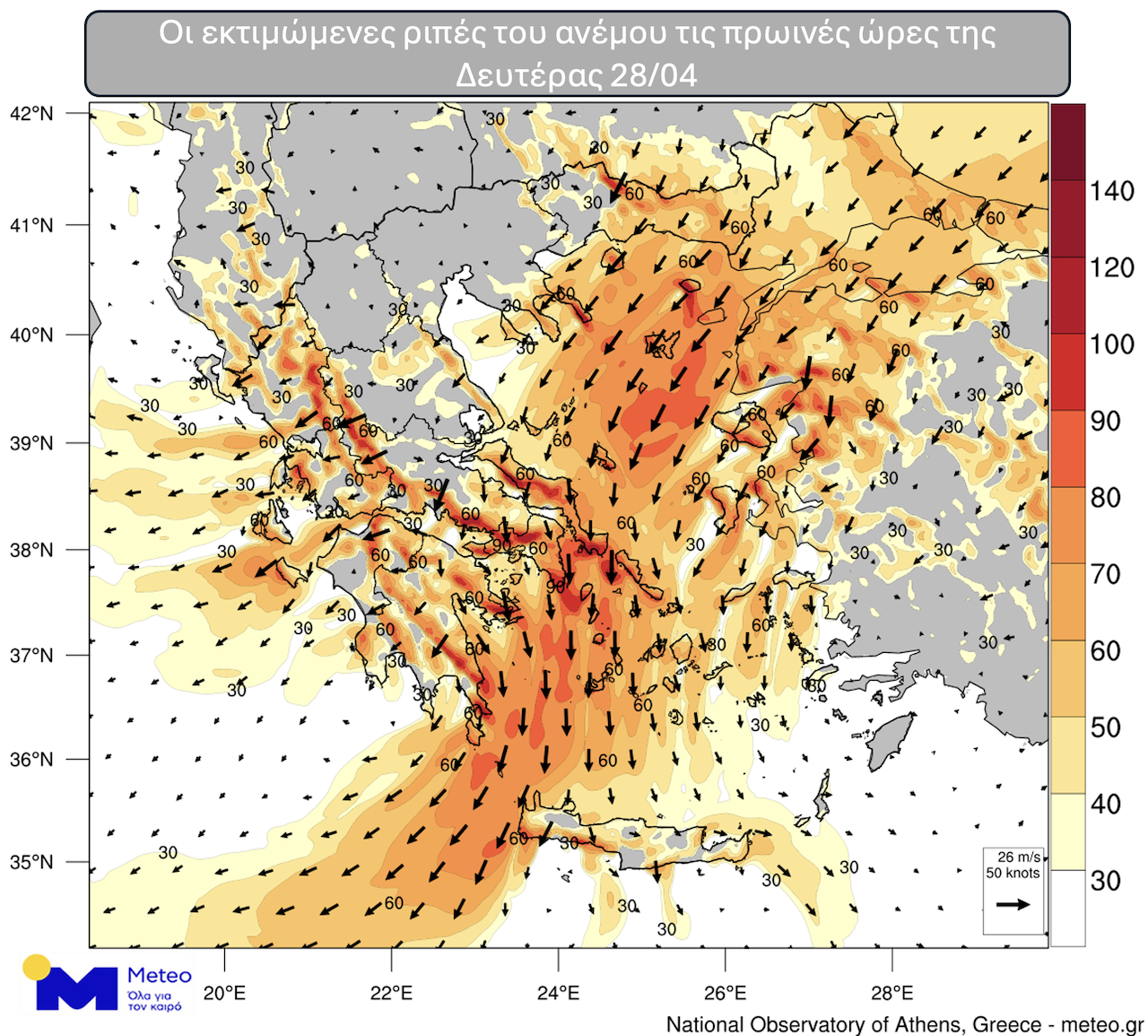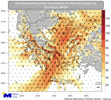 Αύριο, Δευτέρα 28 Απριλίου αναμένεται να επικρατήσουν βόρειοι-βορειοανατολικοί άνεμοι στο Αιγαίο με εντάσεις έως 6-7 και τοπικά 8 μποφόρ, ενώ στο Ιόνιο αναμένονται γενικά ανατολικοί-βορειοανατολικοί άνεμοι με εντάσεις έως 4-5 και τοπικά 6 μποφόρ. Οι ριπές του ανέμου σε τμήματα του Αιγαίου και στα ηπειρωτικά αναμένεται να ξεπεράσουν τα 70-80 km/h και τοπικά τα 90-100 km/h, όπως διακρίνεται και στους παρακάτω χάρτες για τις πρωινές και απογευματινές ώρες της Δευτέρας.