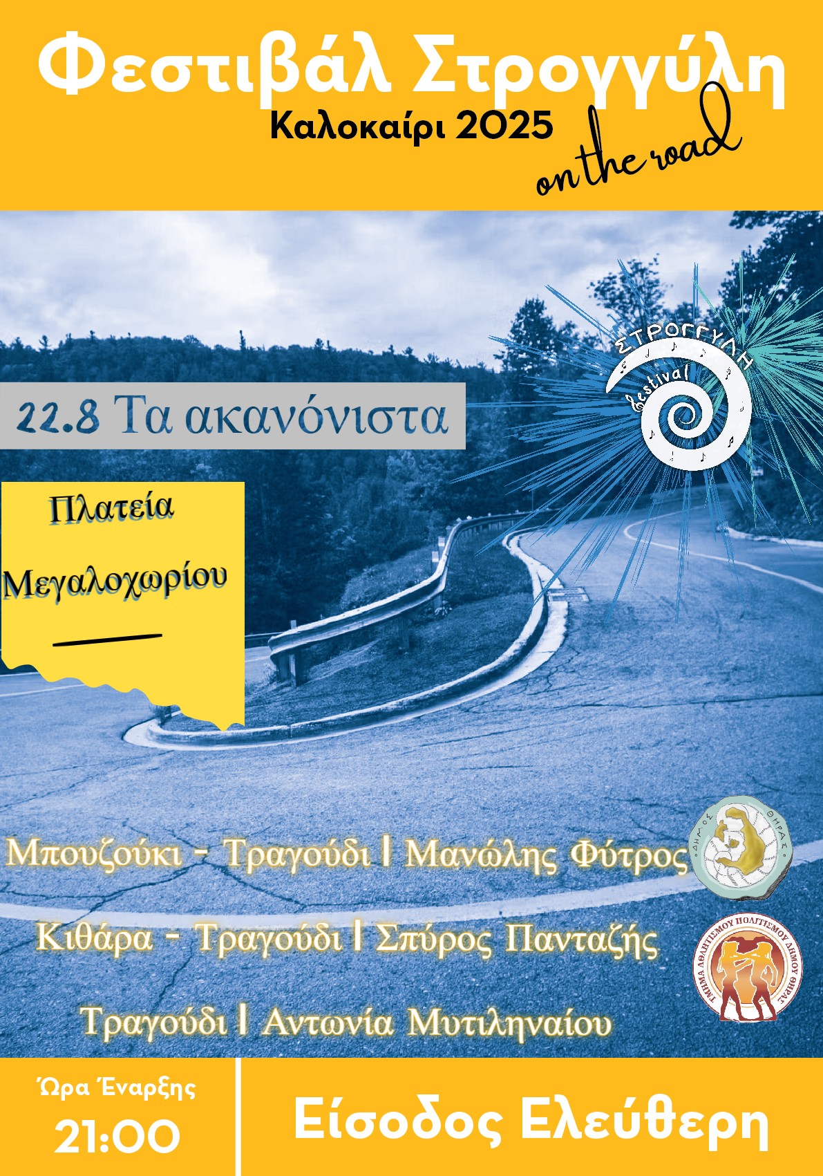 ฮคฮทฮฝ ฮ ฮฑฯฮฑฯฮบฮตฯ ฮฎ 22 ฮฯ ฮณฮฟฯฯฯฮฟฯ , ฯฯฮฑ 21:00, ฮท ฮบฮตฮฝฯฯฮนฮบฮฎ ฯฮปฮฑฯฮตฮฏฮฑ ฯฮฟฯ ฮฮตฮณฮฑฮปฮฟฯฯฯฮฏฮฟฯ ฮธฮฑ ฯฮนฮปฮฟฮพฮตฮฝฮฎฯฮตฮน ฯฮท ฮผฮฟฯ ฯฮนฮบฮฎ ฯฮฑฯฮฌฯฯฮฑฯฮท “ฮคฮฑ ฮฑฮบฮฑฮฝฯฮฝฮนฯฯฮฑ” ฯฯฮฟ ฯฮปฮฑฮฏฯฮนฮฟ ฯฮฟฯ “ฮฆฮตฯฯฮนฮฒฮฌฮป ฮฃฯฯฮฟฮณฮณฯฮปฮท on the road.