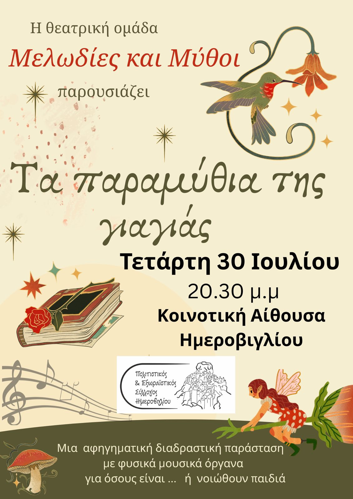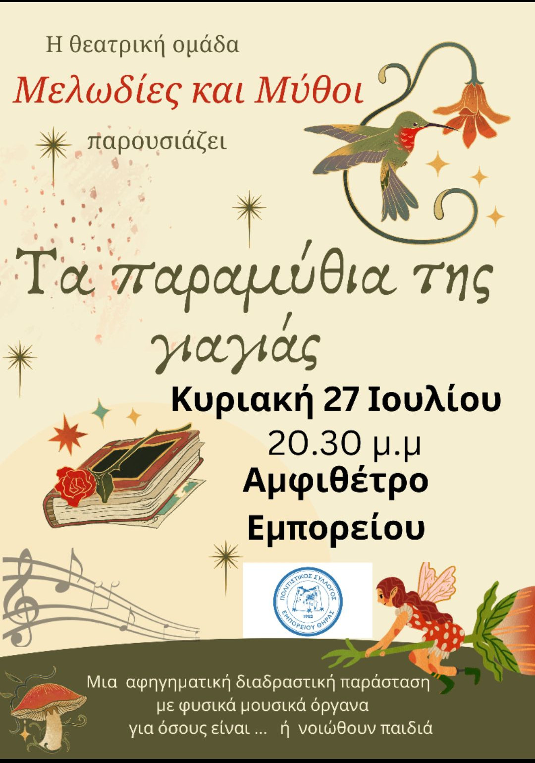 Η θεατρική ομάδα “Μελωδίες και μύθοι” έρχεται στη Σαντορίνη και τις επόμενες ημέρες θα παρουσιάσει στην Οία, στο Εμπορείο, στον Πύργο και στο Ημεροβίγλι, την αφηγηματική διαδραστική παράσταση “Τα παραμύθια της γιαγιάς”.