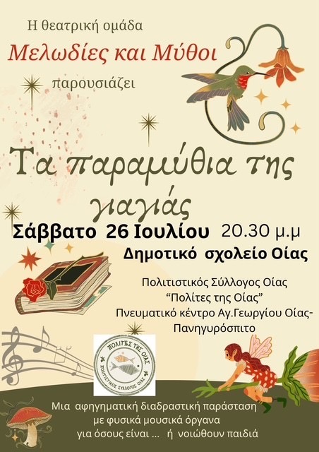 – Σάββατο 26/7 | Δημοτικό Σχολείο Οίας | Διοργάνωση: Πολίτες της Οίας και Πνευματικό Κέντρο Αγ. Γεωργίου-Πανηγυρόσπιτο