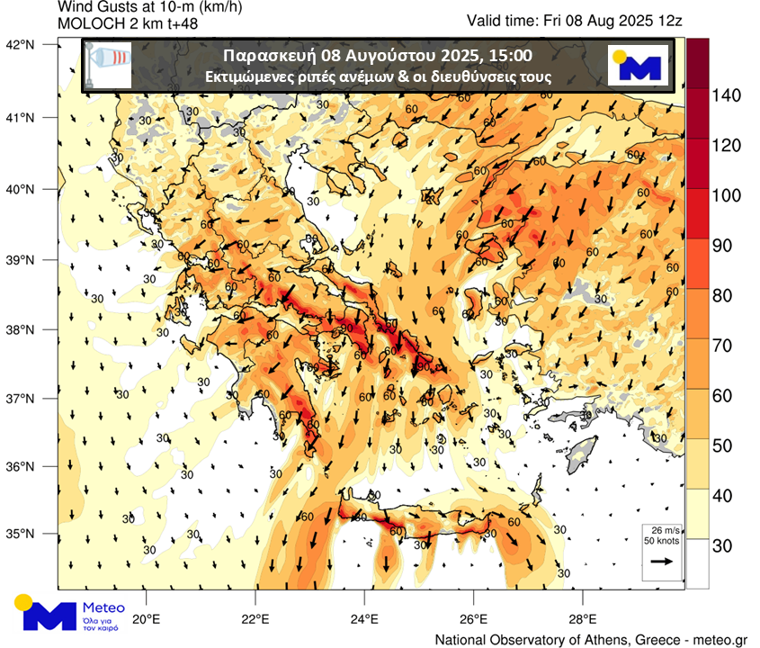 Συγκεκριμένα, σύμφωνα με τα προγνωστικά στοιχεία του Εθνικού Αστεροσκοπείου Αθηνών / Meteo.gr, οι ριπές των ανέμων τις μεσημεριανές ώρες της Πέμπτης 07/08 στην Ανατολική Στερεά θα φτάσουν τα 80 km/h, ενώ στη Νότια Εύβοια, στις Κυκλάδες και στη Νότια Κρήτη τοπικά θα φτάσουν τα 90 km/h. Σύμφωνα με τα διαθέσιμα προγνωστικά στοιχεία, την Παρασκευή 8/8 αναμένεται περαιτέρω ενίσχυση των βορείων ανέμων, με τις ριπές τους σε Ανατολική Στερεά, Νότια Εύβοια, Κυκλάδες και τοπικά στη Νότια Κρήτη να φτάνουν τα 100 km/h, όπως ευδιάκριτα αποτυπώνεται στον παρακάτω χάρτη.