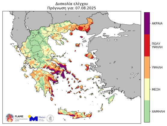 Στους χάρτες παρακάτω παρουσιάζεται η εκτιμωμένη δυσκολία ελέγχου σύμφωνα με το Καναδικό Σύστημα Πυρομετεωρολογικών Δεικτών (Canadian Forest Fire Weather Index System – CFFWIS), προσαρμοσμένο στο πυρικό περιβάλλον της Ελλάδας κατά τη διάρκεια της Πέμπτης 7/8 και της Παρασκευής 8/8.
